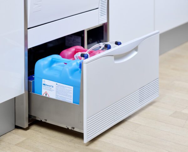 • Practice-optimised washing chamber: With more than 80 baskets and accessories, you can customise the loading configuration to your needs. Reprocess instruments for up to 45 patients quickly and economically in one cycle. For more information please watch our fact check video.